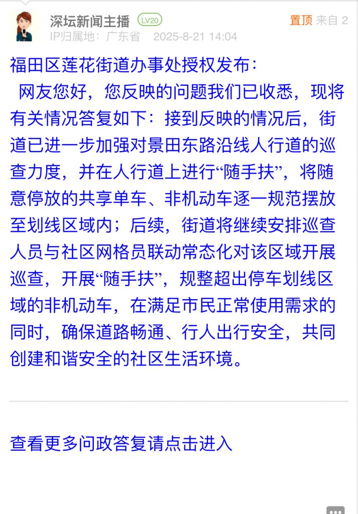 網友您好,您反映的問題我們已收悉,現(xiàn)將有關情況答復如下:接到反映的情況后,街道已進一步加強對景田東路沿線人行道的巡查力度,并在人行道上進行“隨手扶”,將隨意停放的共享單車、非機動車逐一規(guī)范擺放至劃線區(qū)域內;后續(xù),街道將繼續(xù)安排巡查人員與社區(qū)網格員聯(lián)動常態(tài)化對該區(qū)域開展巡查,開展“隨手扶”,規(guī)整超出停車劃線區(qū)域的非機動車,在滿足市民正常使用需求的同時,確保道路暢通、行人出行安全,共同創(chuàng)建和諧安全的社區(qū)生活環(huán)境。