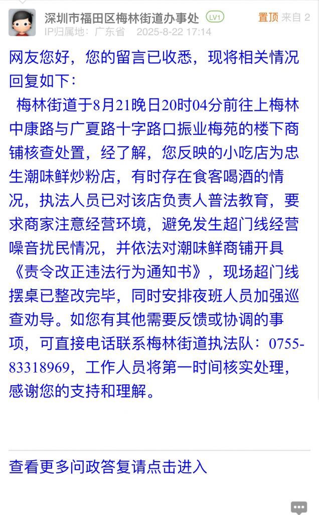 梅林街道于8月21晚日20時04分前往上梅林中康路與廣夏路十字路口振業(yè)梅苑的樓下商鋪核查處置,經了解,您反映的小吃店為忠生潮味鮮炒粉店,有時存在食客喝酒的情況,執(zhí)法人員已對該店負責人普法教育,要求商家注意經營環(huán)境,避免發(fā)生超門線經營噪音擾民情況,并依法對潮味鮮商鋪開具《責令改正違法行為通知書》,現(xiàn)場超門線擺桌已整改完畢,同時安排夜班人員加強巡查勸導。如您有其他需要反饋或協(xié)調的事項,可直接電話聯(lián)系梅林街道執(zhí)法隊:0755-83318969,工作人員將第一時間核實處理,感謝您的支持和理解。