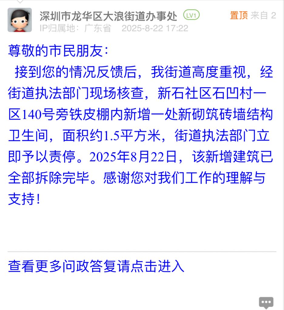 接到您的情況反饋后,我街道高度重視,經街道執(zhí)法部門現(xiàn)場核查,新石社區(qū)石凹村一區(qū)140號旁鐵皮棚內新增一處新砌筑磚墻結構衛(wèi)生間,面積約1.5平方米,街道執(zhí)法部門立即予以責停。2025年8月22日,該新增建筑已全部拆除完畢。感謝您對我們工作的理解與支持!