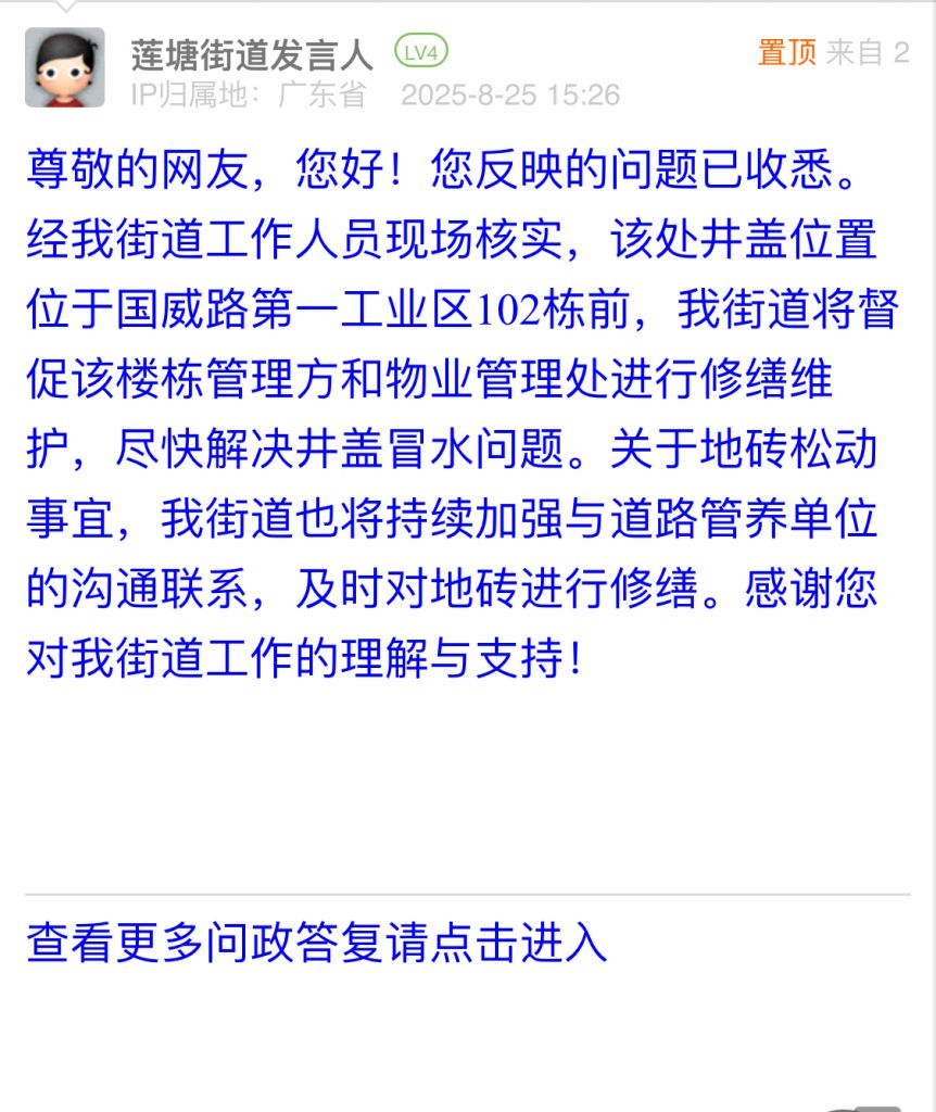 尊敬的網友,您好!您反映的問題已收悉。經我街道工作人員現(xiàn)場核實,該處井蓋位置位于國威路第一工業(yè)區(qū)102棟前,我街道將督促該樓棟管理方和物業(yè)管理處進行修繕維護,盡快解決井蓋冒水問題。關于地磚松動事宜,我街道也將持續(xù)加強與道路管養(yǎng)單位的溝通聯(lián)系,及時對地磚進行修繕。感謝您對我街道工作的理解與支持!