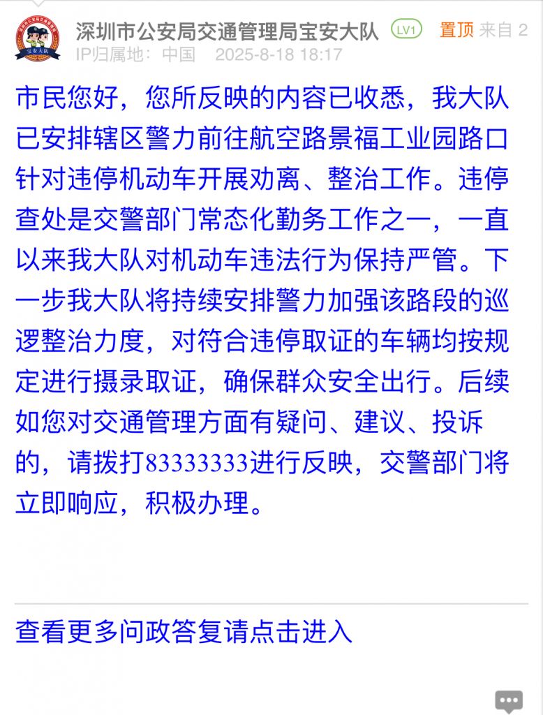 市民您好,您所反映的內容已收悉,我大隊已安排轄區(qū)警力前往航空路景福工業(yè)園路口針對違停機動車開展勸離、整治工作。違停查處是交警部門常態(tài)化勤務工作之一,一直以來我大隊對機動車違法行為保持嚴管。下一步我大隊將持續(xù)安排警力加強該路段的巡邏整治力度,對符合違停取證的車輛均按規(guī)定進行攝錄取證,確保群眾安全出行。后續(xù)如您對交通管理方面有疑問、建議、投訴的,請撥打83333333進行反映,交警部門將立即響應,積極辦理。