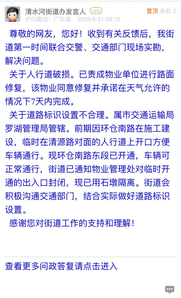 關于道路標識設置不合理。屬市交通運輸局羅湖管理局管轄。前期因環(huán)倉南路在施工建設,臨時在清源路對面的人行道上開口方便車輛通行?,F(xiàn)環(huán)倉南路東段已開通,車輛可正常通行,街道已通知物業(yè)管理處對臨時開通的出入口封閉,現(xiàn)已用石墩隔離。街道會積極溝通交通部門,結合實際做好道路標識設置。