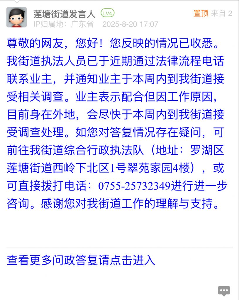 尊敬的網友,您好!您反映的情況已收悉。我街道執(zhí)法人員已于近期通過法律流程電話聯(lián)系業(yè)主,并通知業(yè)主于本周內到我街道接受相關調查。業(yè)主表示配合但因工作原因,目前身在外地,會盡快于本周內到我街道接受調查處理。如您對答復情況存在疑問,可前往我街道綜合行政執(zhí)法隊(地址:羅湖區(qū)蓮塘街道西嶺下北區(qū)1號翠苑家園4樓),或可直接撥打電話:0755-25732349進行進一步咨詢。感謝您對我街道工作的理解與支持。