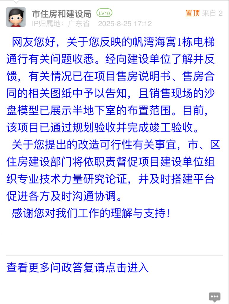 網友您好,關于您反映的帆灣海寓1棟電梯通行有關問題收悉。經向建設單位了解并反饋,有關情況已在項目售房說明書、售房合同的相關圖紙中予以告知,且銷售現(xiàn)場的沙盤模型已展示半地下室的布置范圍。目前,該項目已通過規(guī)劃驗收并完成竣工驗收。