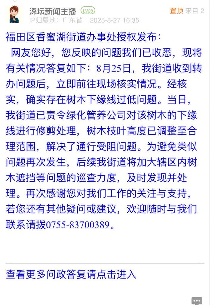 網友您好,您反映的問題我們已收悉,現(xiàn)將有關情況答復如下:8月25日,我街道收到轉辦問題后,立即前往現(xiàn)場核實情況。經核實,確實存在樹木下緣線過低問題。當日,我街道已責令綠化管養(yǎng)公司對該樹木的下緣線進行修剪處理,樹木枝葉高度已調整至合理范圍,解決了通行受阻問題。為避免類似問題再次發(fā)生,后續(xù)我街道將加大轄區(qū)內樹木遮擋等問題的巡查力度,及時發(fā)現(xiàn)并處理。再次感謝您對我們工作的關注與支持,若您還有其他疑問或建議,歡迎隨時與我們聯(lián)系請撥0755-83700389。