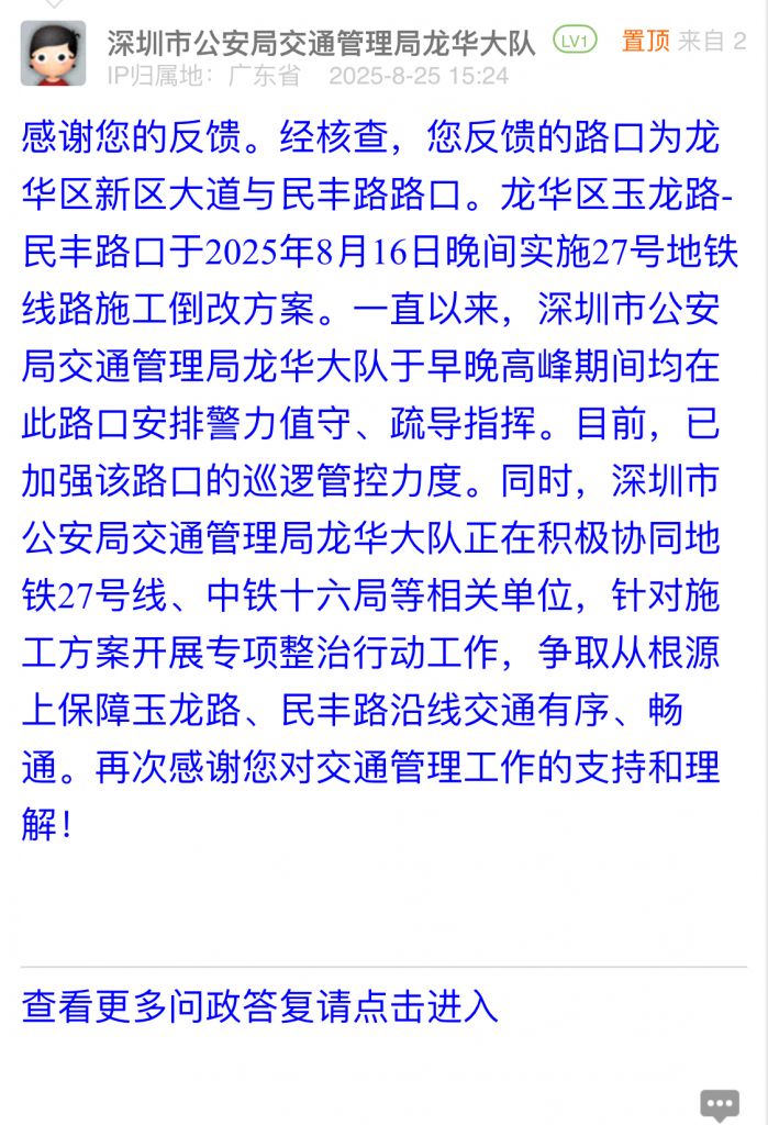 感謝您的反饋。經核查,您反饋的路口為龍華區(qū)新區(qū)大道與民豐路路口。龍華區(qū)玉龍路-民豐路口于2025年8月16日晚間實施27號地鐵線路施工倒改方案。一直以來,深圳市公安局交通管理局龍華大隊于早晚高峰期間均在此路口安排警力值守、疏導指揮。目前,已加強該路口的巡邏管控力度。同時,深圳市公安局交通管理局龍華大隊正在積極協(xié)同地鐵27號線、中鐵十六局等相關單位,針對施工方案開展專項整治行動工作,爭取從根源上保障玉龍路、民豐路沿線交通有序、暢通。再次感謝您對交通管理工作的支持和理解!