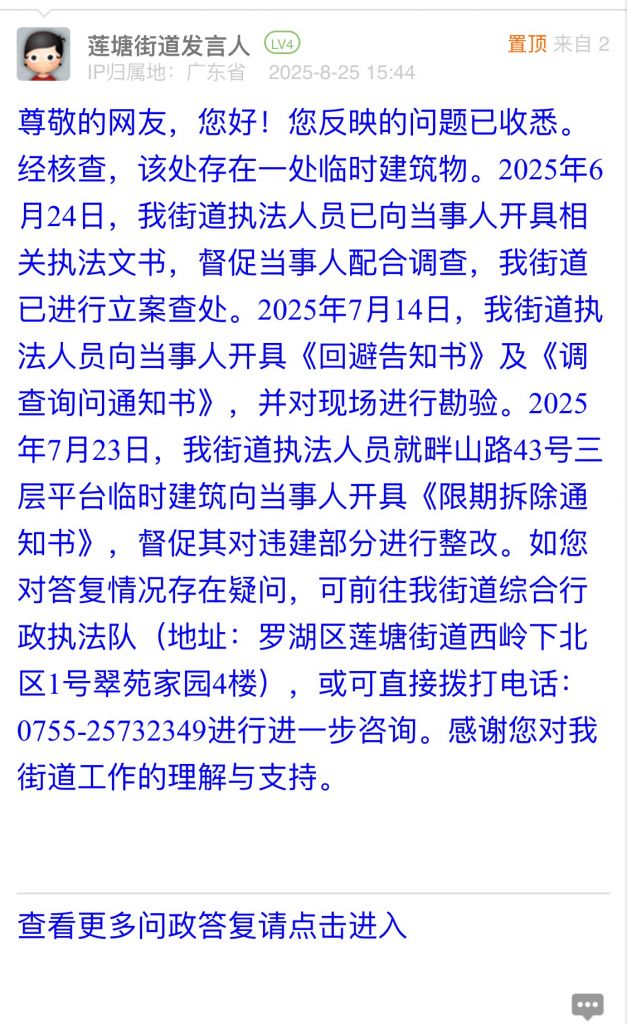 尊敬的網友,您好!您反映的問題已收悉。經核查,該處存在一處臨時建筑物。2025年6月24日,我街道執(zhí)法人員已向當事人開具相關執(zhí)法文書,督促當事人配合調查,我街道已進行立案查處。2025年7月14日,我街道執(zhí)法人員向當事人開具《回避告知書》及《調查詢問通知書》,并對現(xiàn)場進行勘驗。2025年7月23日,我街道執(zhí)法人員就畔山路43號三層平臺臨時建筑向當事人開具《限期拆除通知書》,督促其對違建部分進行整改。如您對答復情況存在疑問,可前往我街道綜合行政執(zhí)法隊(地址:羅湖區(qū)蓮塘街道西嶺下北區(qū)1號翠苑家園4樓),或可直接撥打電話:0755-25732349進行進一步咨詢。感謝您對我街道工作的理解與支持。