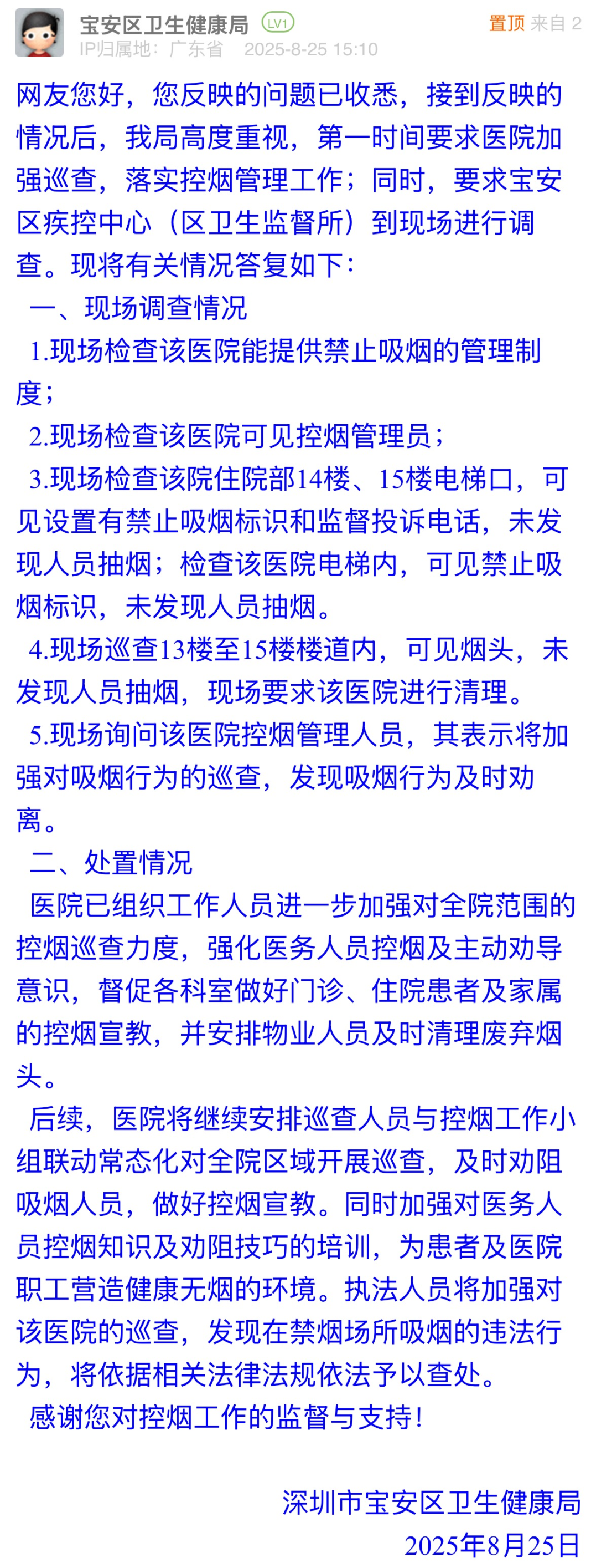 優(yōu)化建議:接到市民反饋后,寶安區(qū)衛(wèi)生健康局快速組織現(xiàn)場(chǎng)調(diào)查,核實(shí)醫(yī)院有禁煙制度、控?zé)煿芾韱T在崗,基礎(chǔ)控?zé)煷胧┖瞬榈轿唬档命c(diǎn)贊。但回應(yīng)中多次強(qiáng)調(diào)“未發(fā)現(xiàn)人員抽煙”,回避對(duì)歷史吸煙行為處置、煙頭來(lái)源及勸阻機(jī)制失效的解釋?zhuān)c市民關(guān)切脫節(jié),難以消除市民對(duì)醫(yī)院日???zé)熌芰Φ膿?dān)憂,建議完善具體控?zé)煷胧?,如加裝煙感報(bào)警裝置,建立核查公示制度等,筑牢“無(wú)煙醫(yī)院”防線。