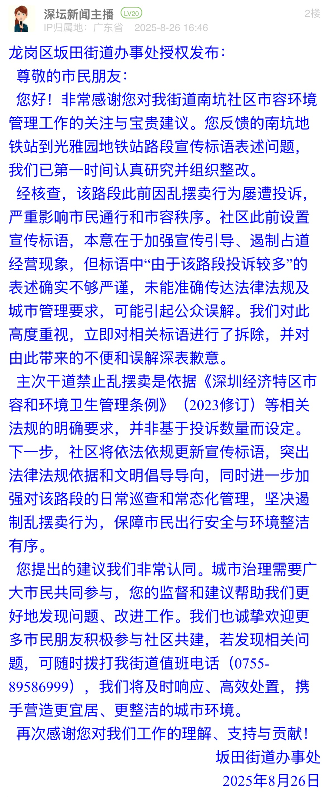 案例點(diǎn)評(píng):標(biāo)語(yǔ)表述不嚴(yán)謹(jǐn)可能引發(fā)公眾誤解,坂田街道辦展現(xiàn)出高效務(wù)實(shí)的態(tài)度,第一時(shí)間拆除涉事標(biāo)語(yǔ),計(jì)劃更新標(biāo)語(yǔ),明確標(biāo)語(yǔ)中提及的禁擺依據(jù)為法規(guī)要求而非投訴數(shù)量?;貞?yīng)中,街道主動(dòng)致歉并公開(kāi)整改邏輯,展現(xiàn)“直面問(wèn)題不推諉”的擔(dān)當(dāng),更以“邀請(qǐng)市民參與共建”為切入點(diǎn),構(gòu)建“政府主導(dǎo)+公眾監(jiān)督”的治理閉環(huán)。此次整改有效化解因標(biāo)語(yǔ)表述不當(dāng)引發(fā)的公眾疑慮,彰顯了“以民為師”的共治智慧。