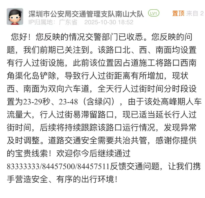 案例點(diǎn)評(píng):南山交管部門在24小時(shí)內(nèi)對(duì)市民所反饋的問題進(jìn)行答復(fù),展現(xiàn)出精準(zhǔn)、高效的治理態(tài)度,既說明過街時(shí)間短的原因,又根據(jù)該路口在高峰期人流大的實(shí)際情況,適當(dāng)延長(zhǎng)過街時(shí)間,體現(xiàn)出“因需調(diào)整、務(wù)實(shí)便民”的理念?;貞?yīng)中,該部門還強(qiáng)調(diào)后續(xù)將持續(xù)跟蹤路口通行情況、及時(shí)優(yōu)化調(diào)整等,展示了精細(xì)化治理的決心和理念。