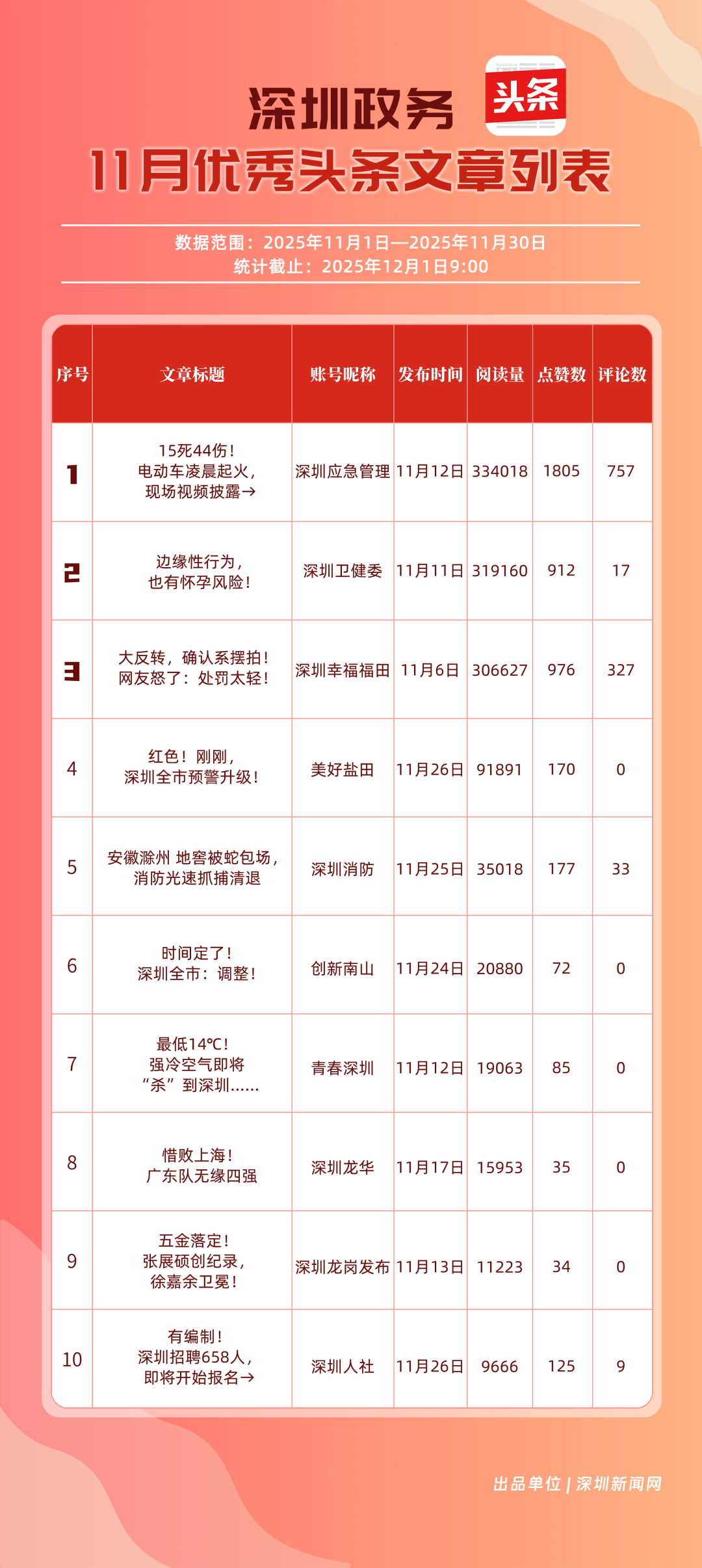 11月,“深圳幸福福田”“深圳應(yīng)急管理”“深圳衛(wèi)健委”“青春深圳”“創(chuàng)新南山”“深圳消防”“深圳龍華”“羅湖發(fā)布”“坪山發(fā)布”“深圳龍崗發(fā)布”共10個(gè)政務(wù)頭條號(hào)入選“優(yōu)秀政務(wù)頭條號(hào)”榜單?!吧钲谛腋8L铩卑l(fā)揮穩(wěn)定,以滿分成績(jī)蟬聯(lián)榜首,彰顯出強(qiáng)大的政務(wù)傳播力與影響力;“深圳應(yīng)急管理”積極發(fā)布應(yīng)急、安全類內(nèi)容,位居第二;“深圳衛(wèi)健委”則以優(yōu)質(zhì)健康類信息吸引市民關(guān)注,排名上升至第3位?!扒啻荷钲凇薄皠?chuàng)新南山”“深圳消防”得分在83分以上。相關(guān)上榜賬號(hào)以內(nèi)容創(chuàng)新為紐帶,聚焦民生,為城市治理現(xiàn)代化與民生服務(wù)精細(xì)化注入了鮮活力量。