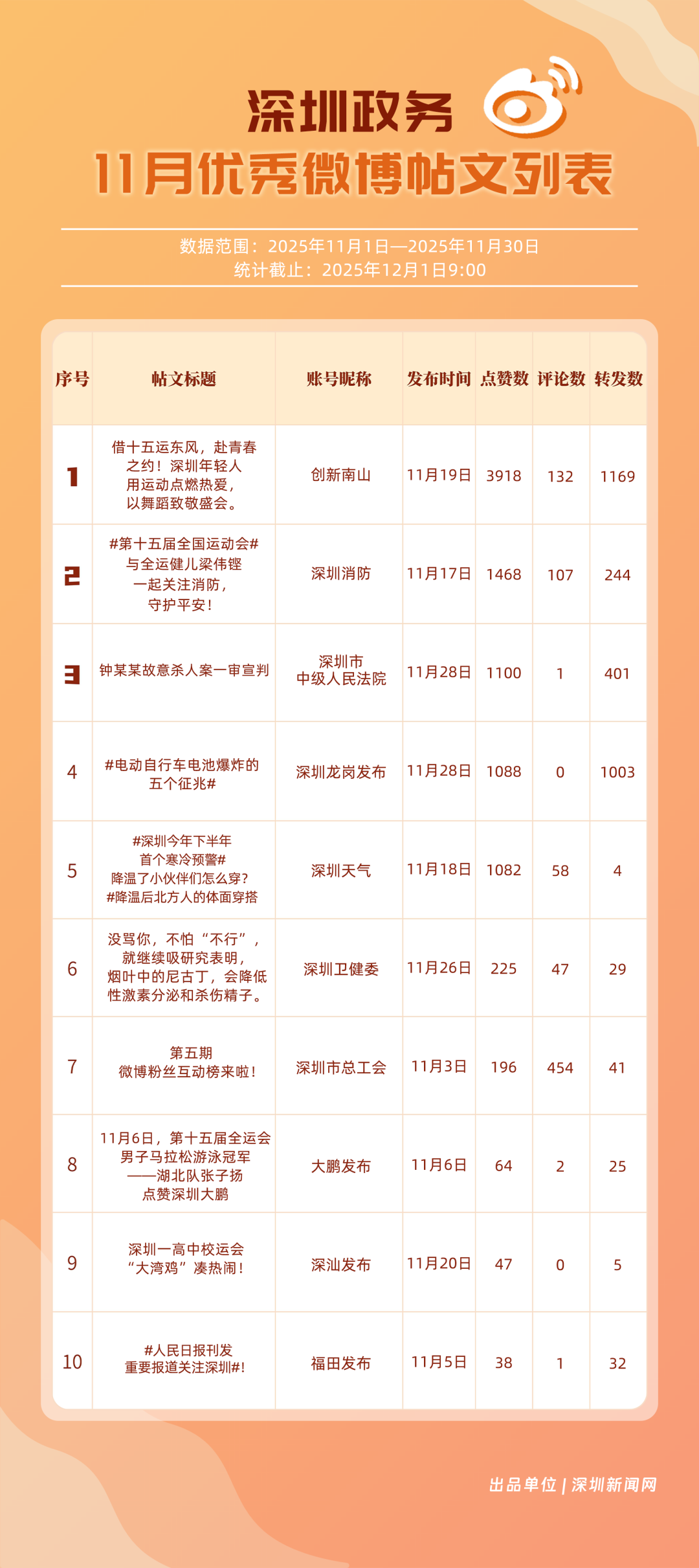 11月,20個(gè)賬號(hào)入選“優(yōu)秀政務(wù)微博號(hào)”榜單,其中包括:“深圳天氣”“深圳市總工會(huì)”“深圳龍崗發(fā)布”“創(chuàng)新南山”“福田發(fā)布”“深圳消防”“深圳衛(wèi)健委”“深汕發(fā)布”“深圳公安”“深圳應(yīng)急管理”等。其中,“深圳天氣”高頻次發(fā)布天氣類信息,受到網(wǎng)民肯定,蟬聯(lián)榜首;“深圳市總工會(huì)”發(fā)布互動(dòng)抽獎(jiǎng)、十五運(yùn)等多元內(nèi)容,排名提升至第二;“深圳龍崗發(fā)布”在傳播指數(shù)獲得較高得分,助力其位列第三。上榜優(yōu)秀政務(wù)微博賬號(hào)以優(yōu)秀內(nèi)容提升賬號(hào)競(jìng)爭(zhēng)力,贏得公眾認(rèn)可,實(shí)現(xiàn)了政務(wù)信息的有效傳播,為政務(wù)新媒體的內(nèi)容運(yùn)營(yíng)與價(jià)值傳遞提供參考。
