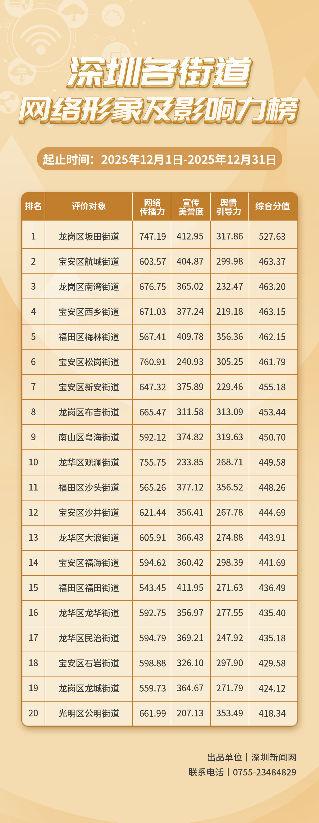 為深入了解深圳市各街道的網(wǎng)絡(luò)形象構(gòu)建狀況和社會影響,推動街道治理“提質(zhì)增效”,增強城市高質(zhì)量發(fā)展動能,深圳新聞網(wǎng)編制推出《深圳各街道網(wǎng)絡(luò)形象及影響力榜》。榜單具有獨立客觀的評價體系,通過數(shù)據(jù)采集和分析,評估各街道的網(wǎng)絡(luò)傳播力、宣傳美譽度及輿情引導(dǎo)力,并對全市11個區(qū)共78個街道的網(wǎng)絡(luò)形象及影響力進行綜合排名。