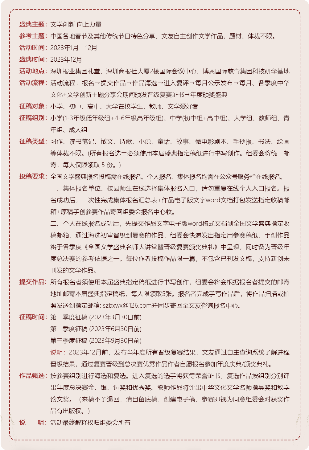 2023年度全國(guó)文學(xué)盛典”是面向小學(xué)、初中、高中學(xué)生,以及教師和文學(xué)愛好者而開展的文學(xué)系列活動(dòng),將文學(xué)的魅力持續(xù)傳播。廣大文學(xué)愛好者自愿報(bào)名參加。在本屆活動(dòng)進(jìn)程中,將繼續(xù)為孩子和文學(xué)愛好者們創(chuàng)建其熱愛的中華文化文學(xué)創(chuàng)作的滋養(yǎng)平臺(tái),為文學(xué)愛好者和優(yōu)秀的文學(xué)特長(zhǎng)生提供更廣闊的創(chuàng)作實(shí)踐平臺(tái)。教育界學(xué)術(shù)研究領(lǐng)域?qū)<医淌凇⒆骷?、?shī)人、文學(xué)評(píng)論家等組成的專家評(píng)審委員會(huì)本著公開、公平、公正的原則,對(duì)參評(píng)作品進(jìn)行審評(píng)。 組委會(huì)在廣大師生文友的支持與建議下,“2023年度全國(guó)文學(xué)盛典”將持續(xù)開展系列文創(chuàng)主題活動(dòng):“全國(guó)文學(xué)盛典之走進(jìn)名師”“全國(guó)青少年冰心文學(xué)盛典2023”、教育部創(chuàng)刊中國(guó)校園文學(xué)《一起向未來·中國(guó)校園文學(xué)》主題征投稿、“校園專場(chǎng)”“專家分享會(huì)”“文學(xué)創(chuàng)新 向上力量——專家進(jìn)校園”“全國(guó)文學(xué)盛典·各季品質(zhì)典禮”“優(yōu)秀作品校園巡展”等等。為參賽選手提供廣泛的交流、學(xué)習(xí)、鍛煉機(jī)會(huì)和展示平臺(tái)。>>>