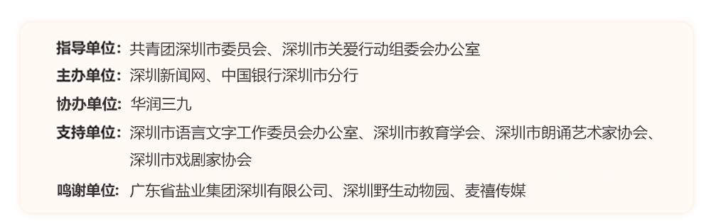 為助力建設良好的青少年閱讀環(huán)境,激發(fā)學生閱讀興趣,倡導親子閱讀,共建和諧家庭關系。2022年,“誰是故事大王·第六季”在共青團深圳市委員會、深圳市關愛行動組委會辦公室的指導下再出發(fā)?;顒佑缮钲谛侣劸W(wǎng)、中國銀行深圳市分行主辦,華潤三九協(xié)辦,得到了廣東省鹽業(yè)集團深圳有限公司、深圳野生動物園、麥禧傳媒的大力支持。更長的活動周期,更豐富的參與形式,更專業(yè)的賽制,等你來解鎖與挑戰(zhàn)!讓閱讀成為最動人的風景,讓故事的魅力感動深圳。說明:所有參賽者報名成功后,均承認并允許主辦方將個人參加本次活動的照片或視頻相關資料刊發(fā)在各類媒體雜志報紙上,用于活動宣傳。